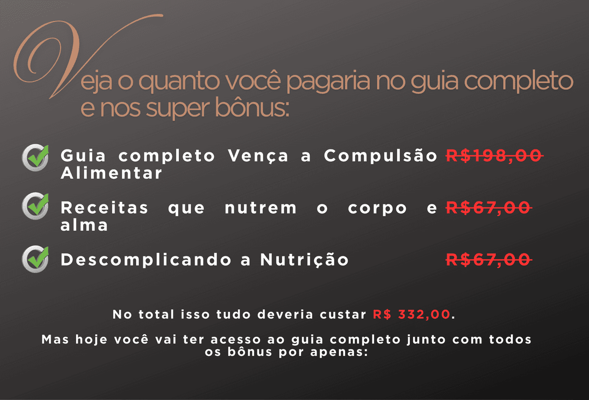 Se por qualquer motivo você achar que o E-book Vença a compulsão alimentar não é o que você estava buscando, no prazo de 7 dias a partir da sua compra, eu devolvo 100% do seu investimento sem ter que fazer nenhuma pergunta.